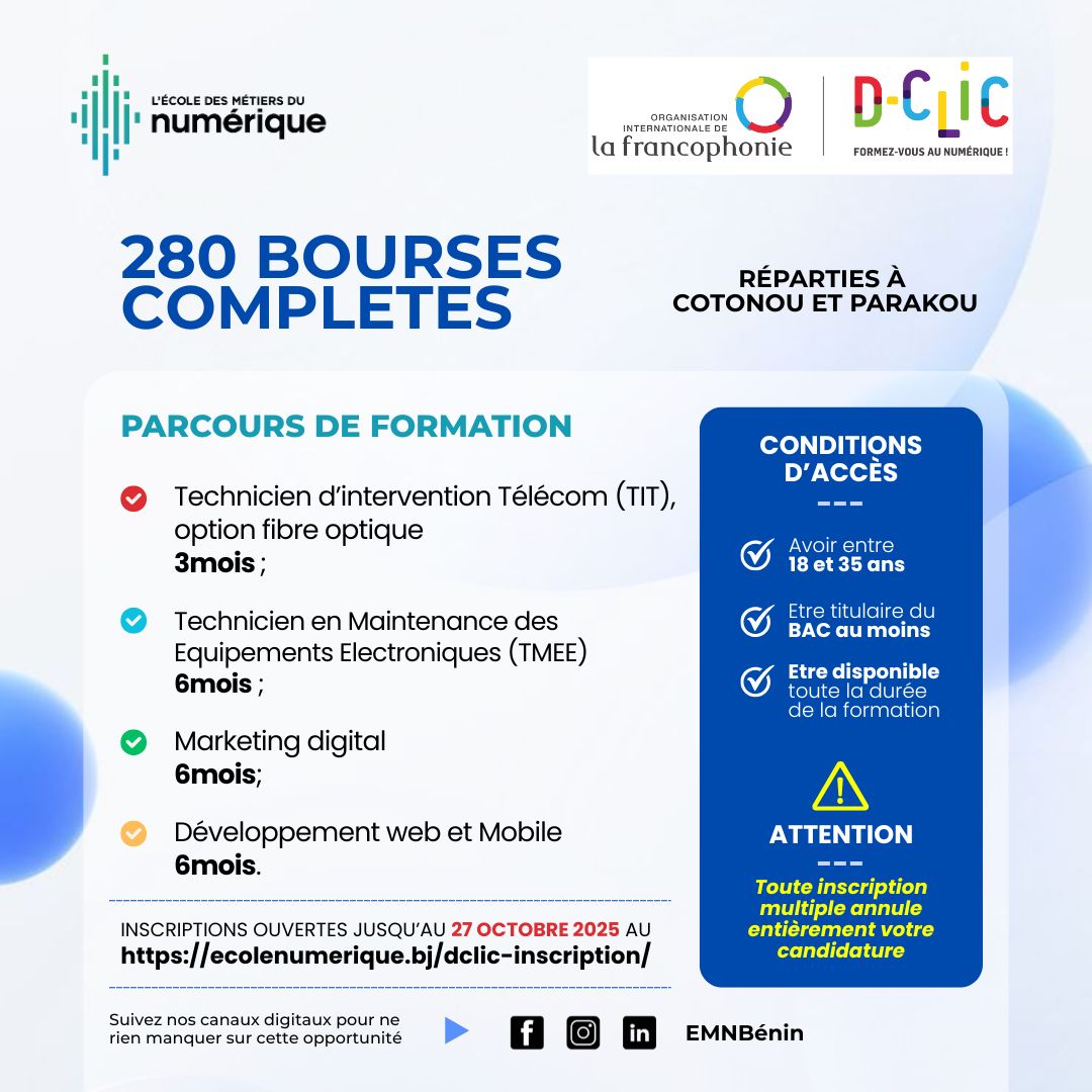APPEL A CANDIDATURE POUR LE RECRUTEMENT DE FORMATEURS DANS LE CADRE DU PROGRAMME D-CLIC, FORMEZ-VOUS AU NUMÉRIQUE AVEC L’OIF TÉLÉCHARGER LA NOTE CANDIDATER Contexte Dans le cadre du projet « D-CLIC : formez-vous au numérique » soutenu par l’Organisation Internationale de la Francophonie (OIF), l’École des Métiers du Numérique (EMN) lance le recrutement de formateurs […]
